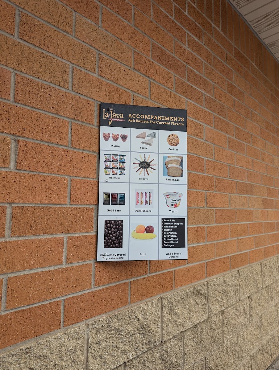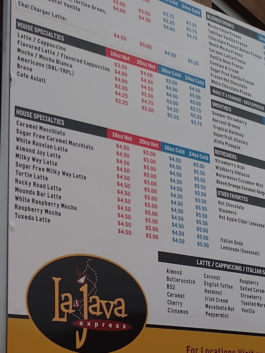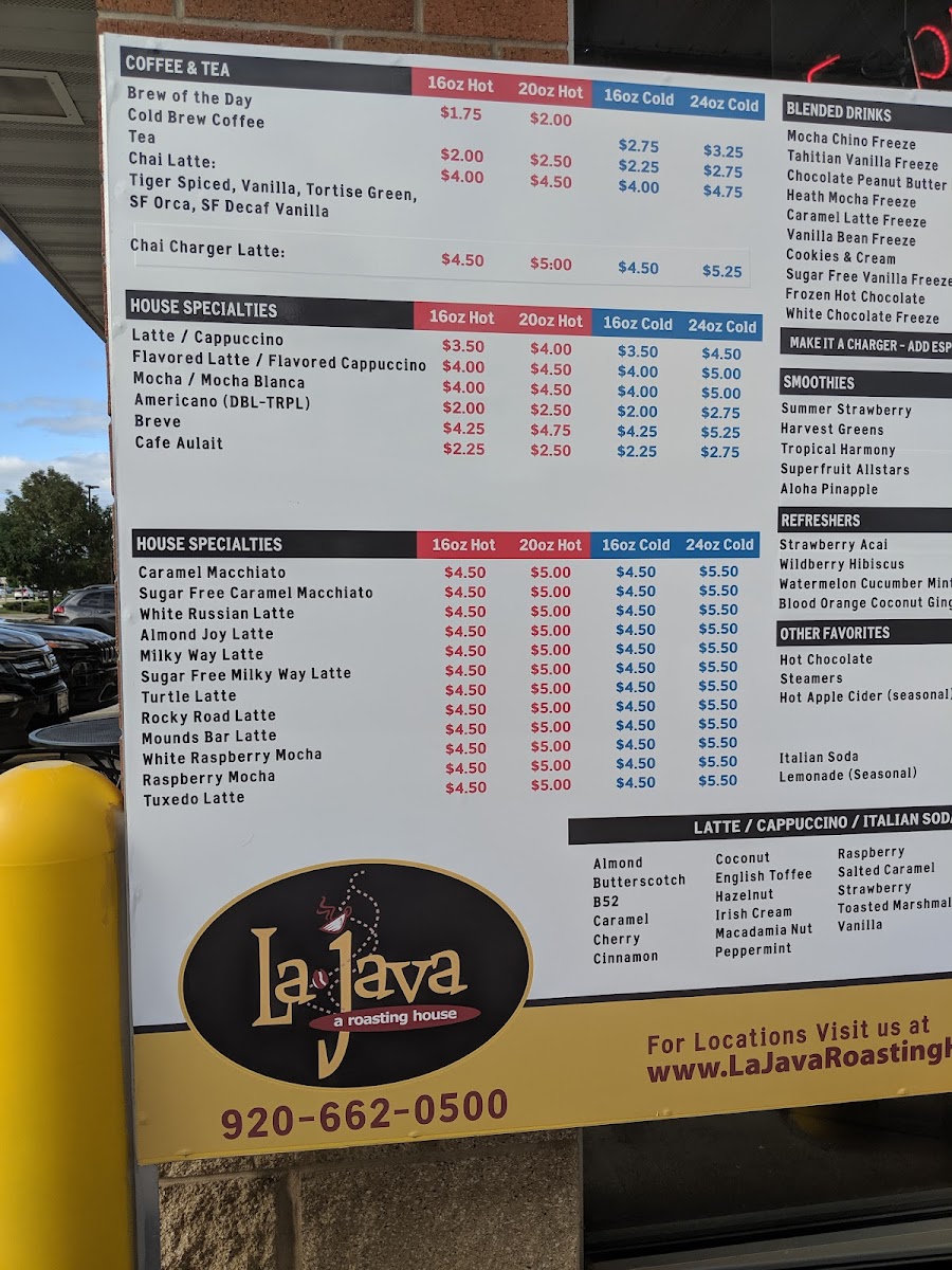 From a reviewer’s perspective, the menu at Lajava Roasting House offers a well-rounded selection of breakfast, lunch, and specialty drinks that makes it easy to find something satisfying any time of day. The breakfast options like Egg Wrap, Breakfast Sandwich, Granola Banana Bowl, Assorted Muffins, and Assorted Scones provide simple but appealing choices, while the lunch menu features hearty items such as Gobbler, Turkey Pesto, Portobello Pesto, Big Red Grilled Cheese, and Black Bean Burger. The drink selection is especially extensive, ranging from espresso bar staples like Medium Roast Coffee - 12 Oz., Dark Roast Coffee - 12 Oz., and Flavored Coffee - 12 Oz. to specialty drinks like Hot Caramel Macchiato - 16 Oz., Iced Mocha - 16 Oz., Hot Chai - 12 Oz., Smoothies 16 Oz., and blended options like Mocha Chino Freeze - 16 Oz. and Chocolate Peanut Butter Charger - 16 Oz., making the menu particularly appealing for coffee lovers. Overall, the variety and clear focus on both classic café foods and creative beverages make the menu a strong highlight.